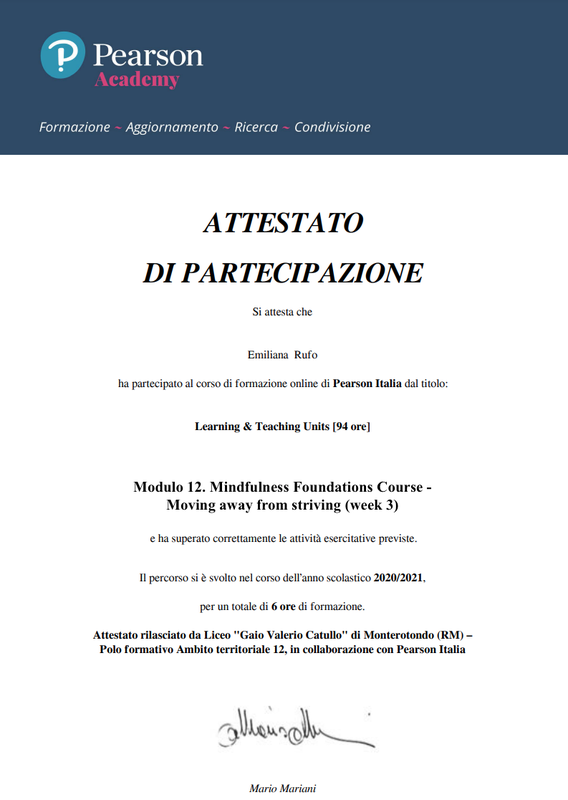 Learning & Teaching Units - Attestato Di Partecipazione – Modulo 12. Mindfulness Foundations Course - Moving away from striving (6 ore)